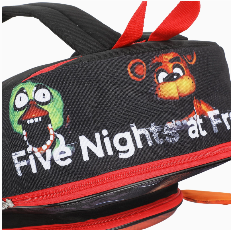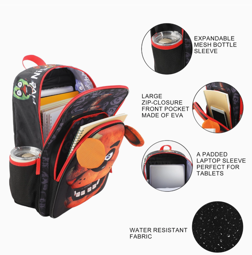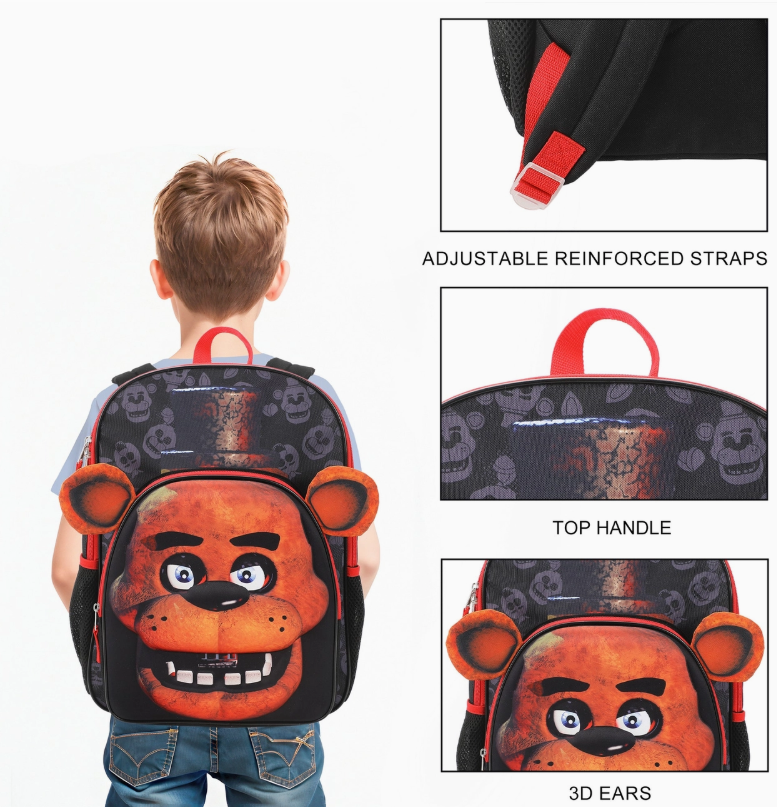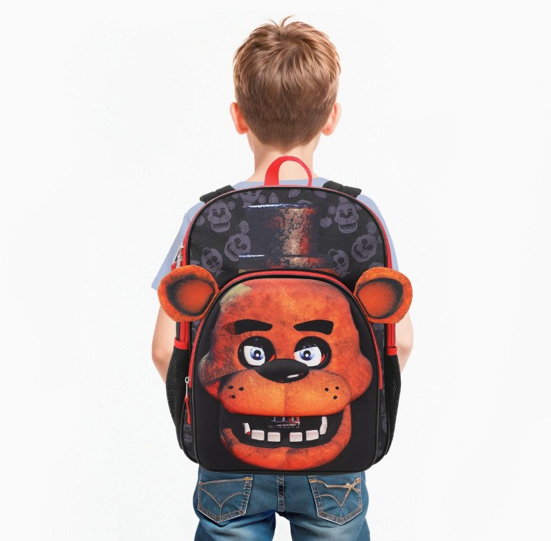 Make a bold statement wherever you go with this Five Nights at Freddy's backpack. Featuring an all-over print of Freddy's face and a molded EVA front pocket shaped like Freddy's head, complete with 3D ears, this bag blends creepy-cool style with everyday function. With padded adjustable straps, mesh pockets with reflective tape, a laptop sleeve, and spacious compartments, it's ready for any adventure. Wipe it clean for easy care.